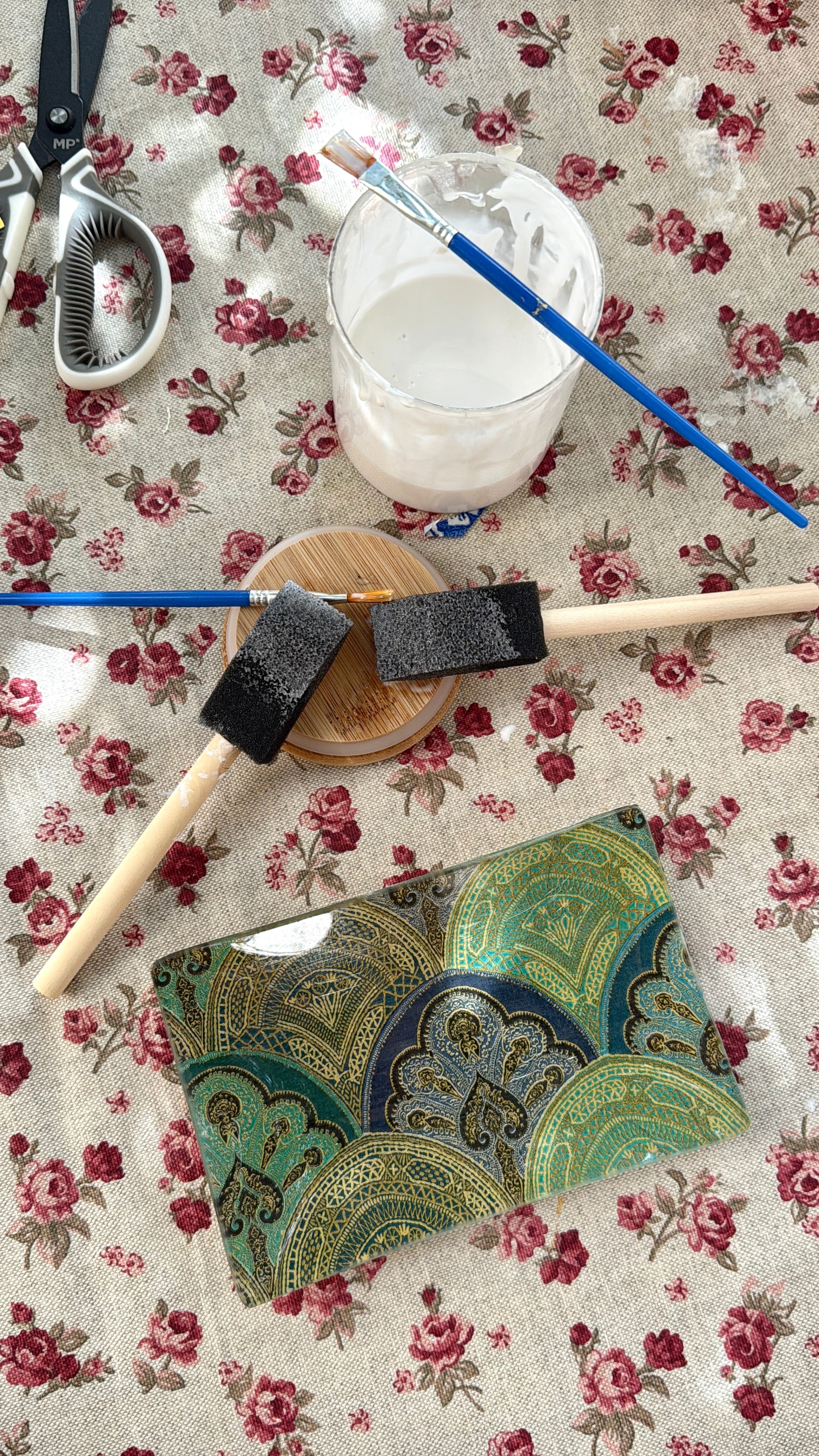 Pinceles, pinturas y cola especial para decoupage